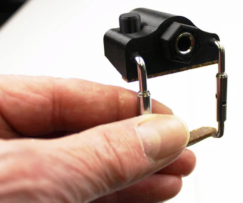We designed a completely new composite body for the RJAplus. These jacks are lighter and less intrusive in appearance than just about any other clamp on jack on the market. Using the same hardware found on a violin chinrest, the cork padded jack assembly attaches to the instrument securely without damage.